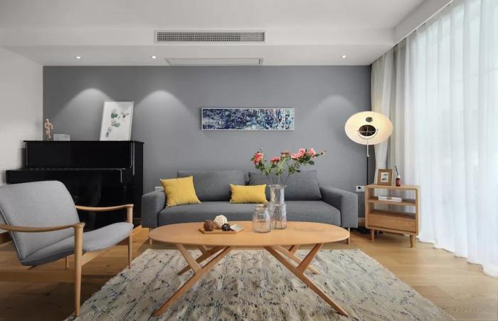 由于空间不大,客厅尽量避免体积过大灯具。最好采用无主灯的设计,光源上可以搭配小小的筒灯更加贴合简洁的主题。
